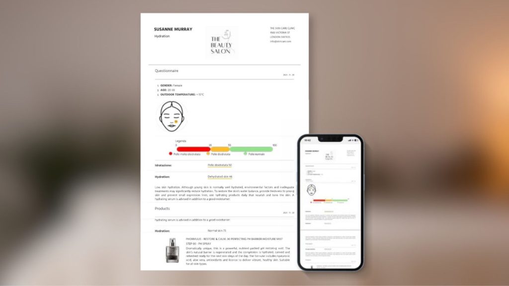 Un rapport détaillé est généré automatiquement avec les résultats, les visuels et des recommandations de soins personnalisées